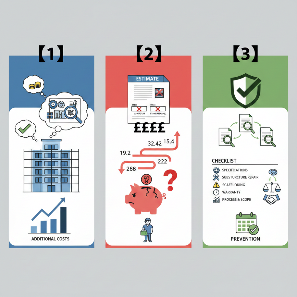 マンションの大規模改修工事を検討していると、まず迷うのが見積もり比較。「安い業者に決めればお得」と思いがちですが、横浜でも安さだけで決めた結果、追加費用が膨らんだ…という相談は意外と多いです。Suumoジャーナルでも、見積もりは価格より“内容”を見ることが重要だと紹介されています。塗料のグレード・下地補修の範囲・保証年数など、価格に現れにくい部分こそ差が出るポイントなんです。